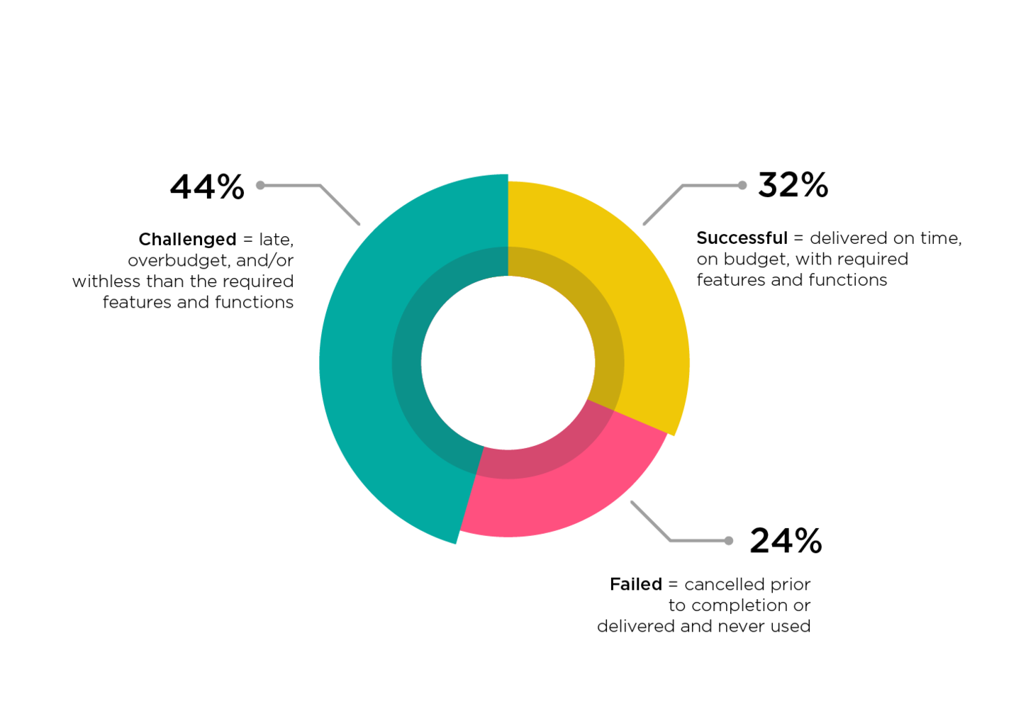 The Standish Group reports that only 32 percent of projects meet their estimates; the remaining 68 percent of them (!) are underestimated.